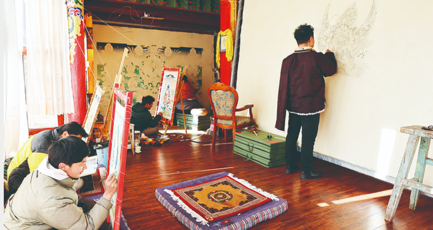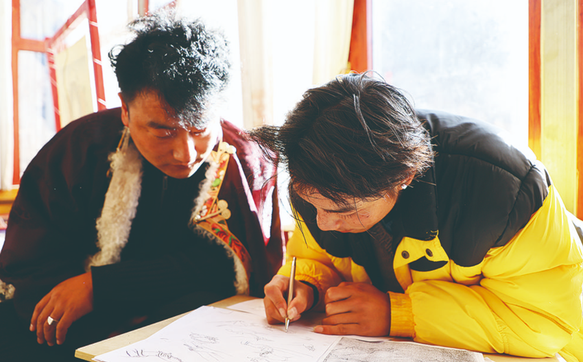 其麥(右)與學(xué)員們在傳習(xí)所內(nèi)認真繪畫。