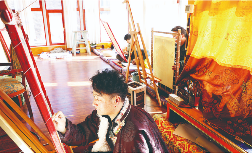 其麥正在繪制唐卡。