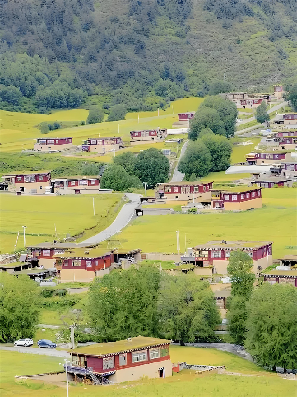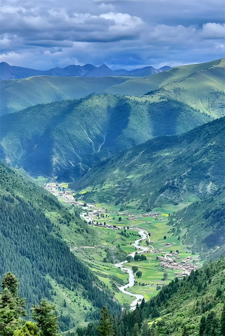 眼前,河谷兩旁的青山上,長滿參天古樹,像一個個衛(wèi)士守護(hù)著這片綠洲;沙魯里山脈的冰雪融水順著蜿蜒的麥曲河,澆灌著兩旁綠意蔥籠的青稞地、豌豆地,滋潤著彌漫香味的種有中藏藥材的土地;絳紅色藏房散落在河谷間,不時有小孩打開窗戶,探出小腦袋,羞澀地露出滿臉燦爛的笑容;臉上布滿高原紅的阿姐沖我們打招呼,說著我們不太懂的藏語,充滿熱情。
