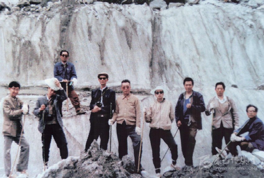 省政府海螺溝考察組在1號(hào)冰川,右起四:夏仲勛、五:劉祖仁,六:盧勛等。(1987年5月14日攝)