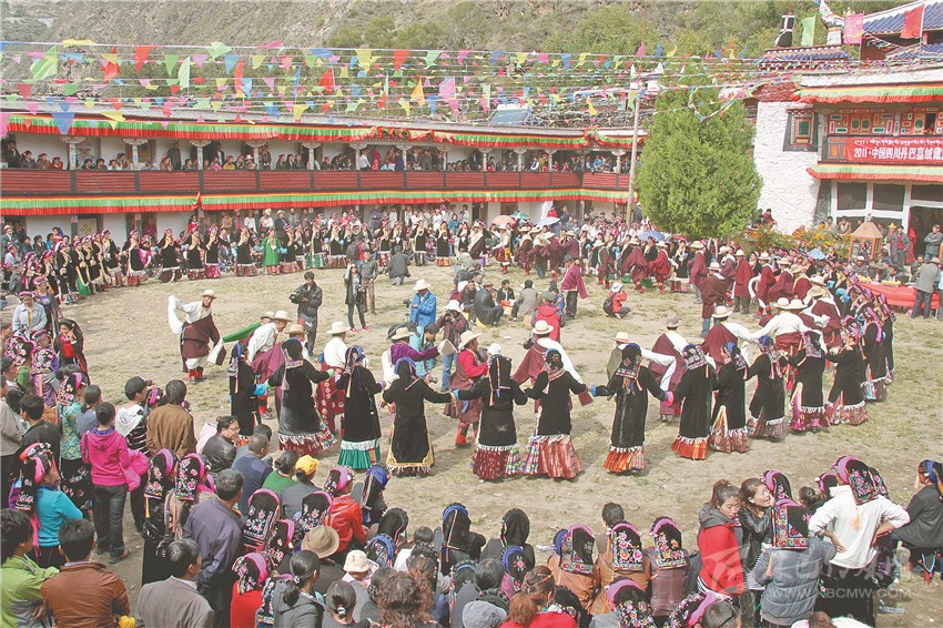 該志記述的與嘉絨鍋莊表演形式、內(nèi)容十分貼切,足見當(dāng)時嘉絨鍋莊的內(nèi)容豐富、曲調(diào)之多是任何一個舞種所不能比擬的。從這段文字描述中可以知道,嘉絨鍋舞的歌詞內(nèi)容主要包括嘉絨藏族的生息發(fā)展、歷史上的各種征戰(zhàn)、區(qū)域版圖的變遷以至四季氣候的變化、春播秋收的時間、生兒育女的賀喜、男女之間的調(diào)情、修房造物的歡慶等等。