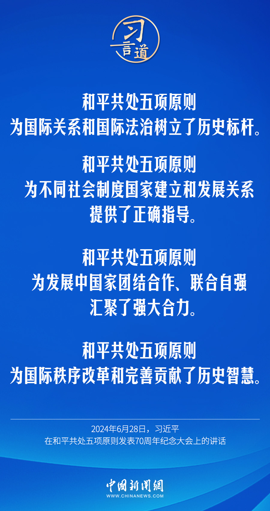 “面對和平還是戰(zhàn)爭、繁榮還是衰退、團(tuán)結(jié)還是對抗的歷史抉擇,我們比以往任何時候都更加需要弘揚(yáng)和平共處五項(xiàng)原則的精神內(nèi)涵,朝著構(gòu)建人類命運(yùn)共同體的崇高目標(biāo)不懈努力?!?月28日,習(xí)近平主席出席和平共處五項(xiàng)原則發(fā)表70周年紀(jì)念大會并發(fā)表重要講話。習(xí)主席在講話中,回顧總結(jié)了和平共處五項(xiàng)原則發(fā)表的歷史淵源、重要意義,深刻闡述了構(gòu)建人類命運(yùn)共同體理念的豐富內(nèi)涵、重要貢獻(xiàn),鄭重提出了推進(jìn)全球和平與發(fā)展事業(yè)的中國倡議,明確宣布了一系列更好支持“全球南方”合作的中國行動,再次向世界宣示了中國走和平發(fā)展道路的堅(jiān)定決心。