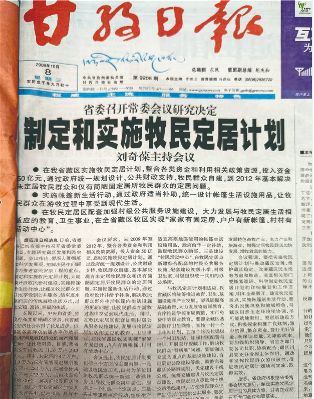 翻開2008年10月8日《甘孜日報》第一版,頭條新聞《制定和實施牧民定居計劃》中載明,省委、省政府作出決定,把解決民生問題作為推進(jìn)富民安康工程的重點,在全省涉藏地區(qū)牧區(qū)推行“牧民定居計劃”,力求在2012年結(jié)束全省涉藏地區(qū)牧民的游牧無定居生活。2009年1月,甘孜州的摸底數(shù)據(jù)表明,“牧民定居行動計劃”的落地實施,會讓當(dāng)?shù)?.7萬戶、26萬牧民直接獲益。