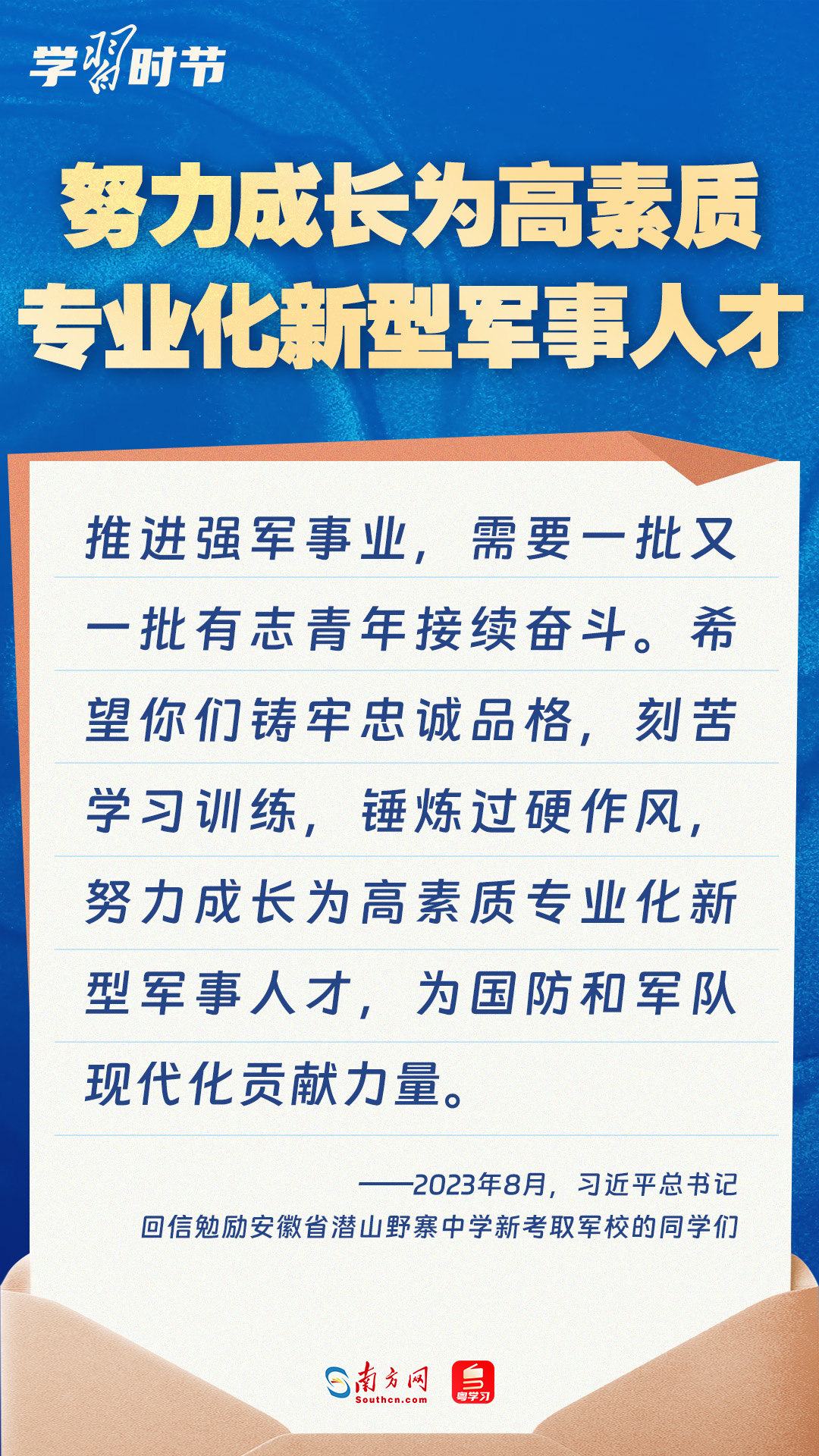 強(qiáng)國必須強(qiáng)軍,軍強(qiáng)才能國安。黨的十八大以來,習(xí)近平總書記始終牽掛一線官兵冷暖,高度重視我軍院校教育和人才培養(yǎng)工作,多次給部隊官兵、軍校學(xué)員等回信。讓我們一起重溫總書記的諄諄寄語!