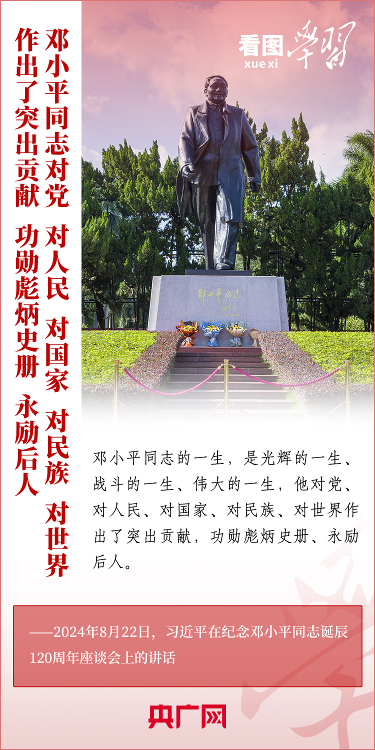 8月22日,習近平總書記在紀念鄧小平同志誕辰120周年座談會上發(fā)表重要講話指出,鄧小平同志的歷史功勛是全方位的、開創(chuàng)性的,對中國和世界的影響是深刻的、長遠的??倳洀娬{(diào),對鄧小平同志最好的紀念,就是把他開創(chuàng)的中國特色社會主義事業(yè)繼續(xù)推向前進。我們要緊緊圍繞以中國式現(xiàn)代化全面推進強國建設(shè)、民族復興偉業(yè)這個中心任務,繼往開來,奮發(fā)進取。一起來學習!