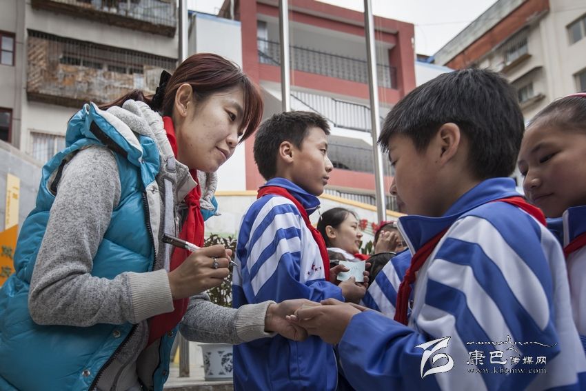 體操冠軍汪鑫在康定東大街小學為小學生簽名。