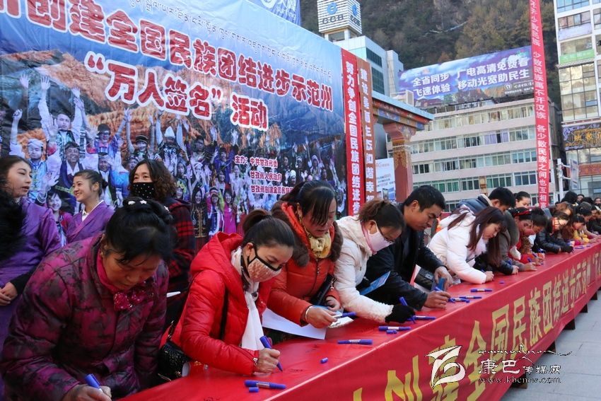 州人大常委會(huì)副主任李致民宣布創(chuàng)建全國(guó)民族團(tuán)結(jié)進(jìn)步示范州“萬(wàn)人簽名”活動(dòng)正式開始后,州領(lǐng)導(dǎo)汪洋、李致民、楊國(guó)元、范文華、蔣秀英、楊學(xué)康以及甘孜軍分區(qū)、駐州武警部隊(duì)領(lǐng)導(dǎo)同州級(jí)機(jī)關(guān)、志愿者、個(gè)體工商戶、學(xué)生、駐軍、政法干警、康定縣黨政機(jī)關(guān)干部代表近千人,陸續(xù)到“萬(wàn)人簽名”條幅上簽下了自己的姓名。