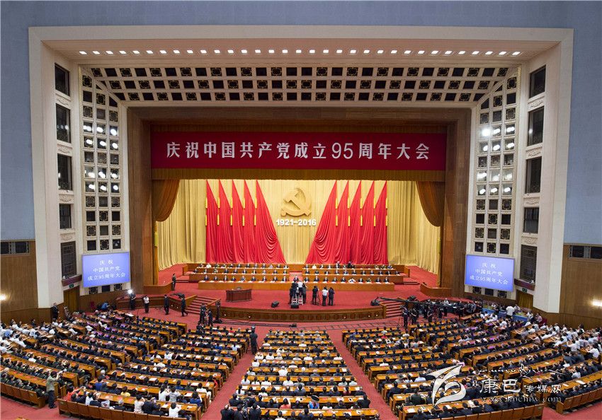 人民大會(huì)堂雄偉莊嚴(yán),萬(wàn)人大禮堂燈火輝煌。主席臺(tái)上方懸掛著“慶祝中國(guó)共產(chǎn)黨成立95周年大會(huì)”會(huì)標(biāo)。帷幕正中,由鐮刀和錘頭組成的中國(guó)共產(chǎn)黨黨徽在十面紅旗映襯下熠熠生輝,“1921-2016”字樣格外醒目。大禮堂二層眺臺(tái)懸掛橫幅:緊密團(tuán)結(jié)在以習(xí)近平同志為總書(shū)記的黨中央周?chē)?,銳意進(jìn)取、開(kāi)拓創(chuàng)新,全面推進(jìn)黨的建設(shè)新的偉大工程,為實(shí)現(xiàn)“兩個(gè)一百年”奮斗目標(biāo)、實(shí)現(xiàn)中華民族偉大復(fù)興的中國(guó)夢(mèng)而努力奮斗!