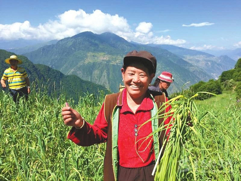 彭州市引入彭州蔬菜協(xié)會、彭州萱源農(nóng)業(yè)有限公司在黑水縣雙溜索鄉(xiāng)俄瓜村建設(shè)100畝大蒜標(biāo)準(zhǔn)化種植基地。圖為貧困群眾采收蒜薹。