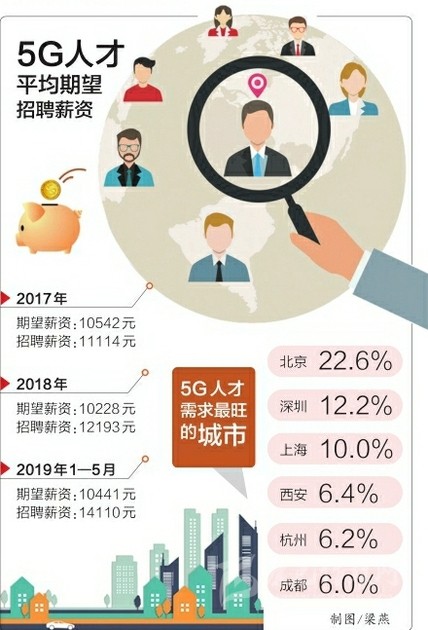 數(shù)據(jù)顯示,今年1—5月,5G相關(guān)人才平均招聘月薪為14110元,較2018年平均月薪水平高出15.7%,其增幅較2018年高出6個(gè)百分點(diǎn)。3年來(lái),企業(yè)的5G人才招聘預(yù)算在逐年增高,平均招聘月薪大幅上漲,但求職者的平均期望薪資卻一直低于平均招聘薪資。相較于此前運(yùn)營(yíng)商官方表述的“2020年5G正式商用”時(shí)間表,工信部將5G牌照至少提前了半年發(fā)放。5G的提前商業(yè)化和激烈的競(jìng)爭(zhēng)使得企業(yè)對(duì)于相關(guān)人才的需求更加的迫切,從不斷飆升的平均招聘月薪中可見(jiàn)一斑。