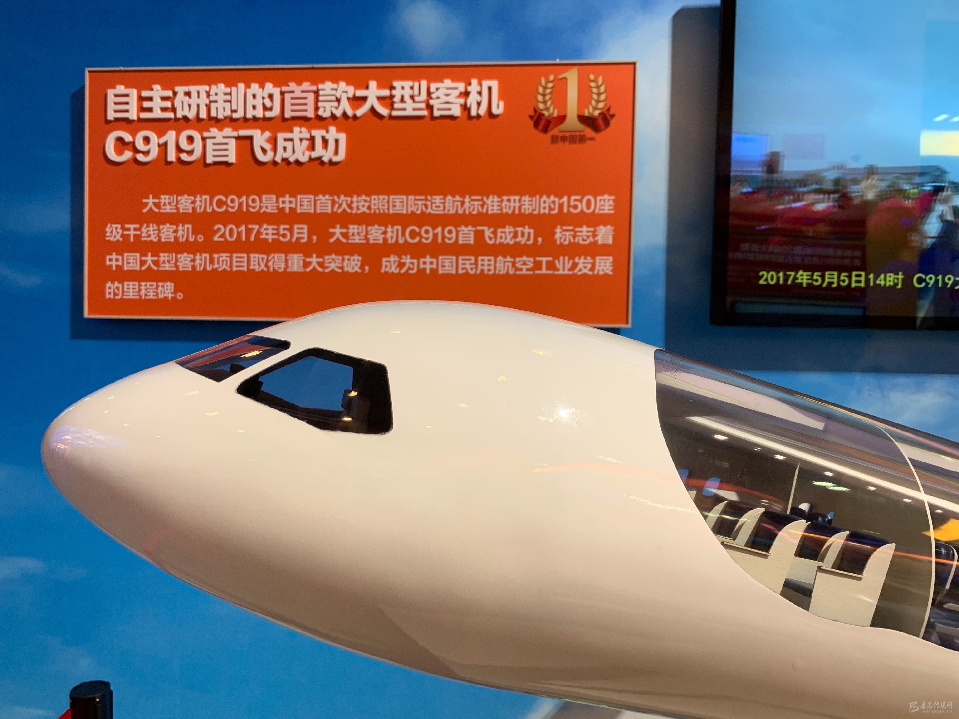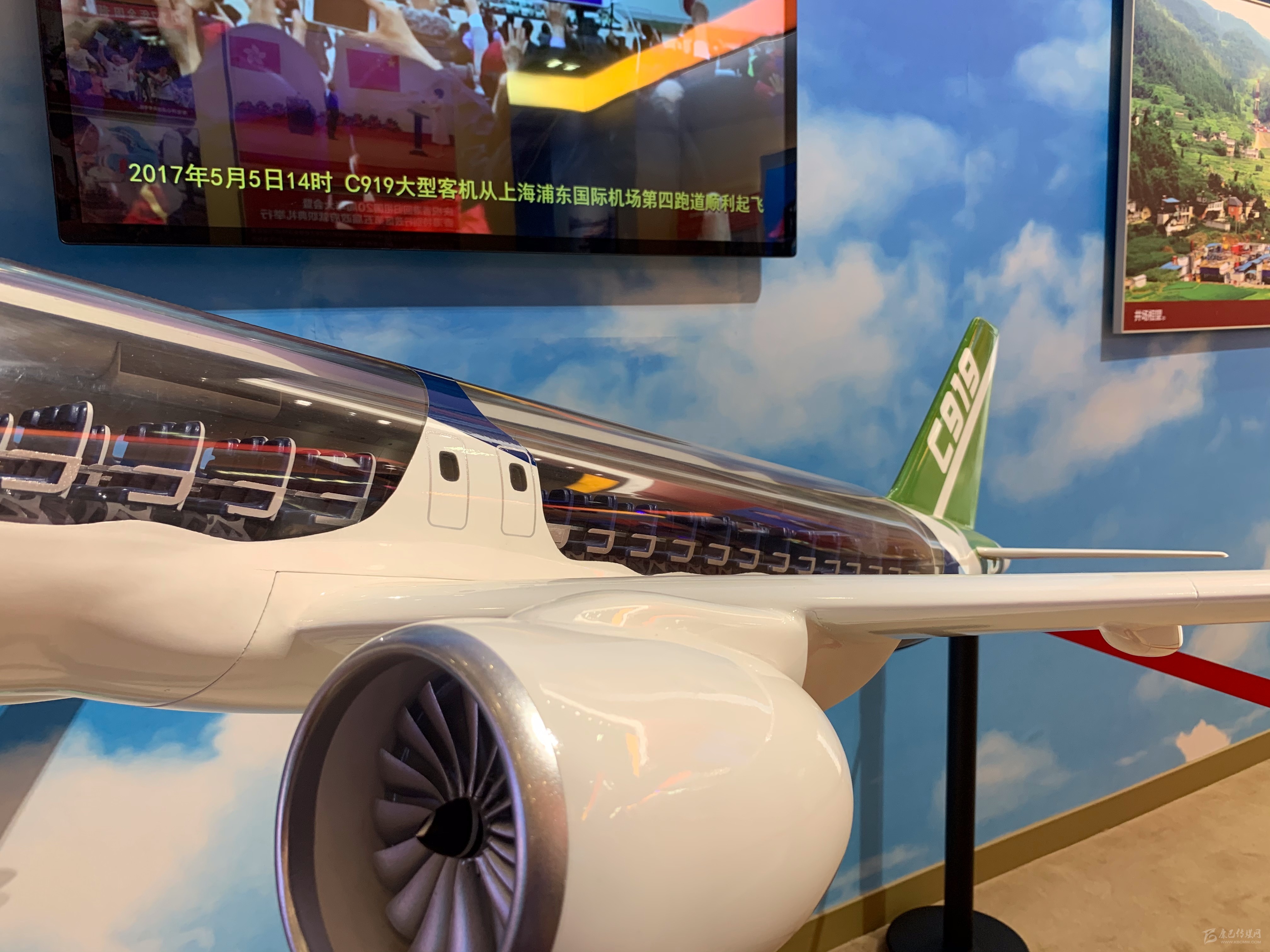 在2017年展區(qū),C919大飛機模型,配合解說圖片以及總裝下線當日的視頻展出。