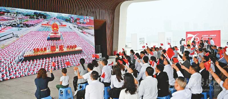 上午10時(shí),慶祝中華人民共和國(guó)成立70周年大會(huì)開(kāi)始。通過(guò)電視信號(hào),大會(huì)盛況傳遞至每個(gè)現(xiàn)場(chǎng)?!芭c祖國(guó)母親同在,祝福祖國(guó)繁榮昌盛。”這是大家共同的心聲。□本報(bào)記者 林凌 何勤華 程文雯 徐中成 陳碧紅 文莎