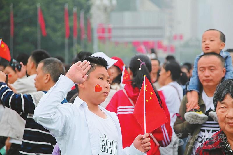 在內(nèi)江市大洲廣場(chǎng),許多市民臉上貼著國(guó)旗,歡欣地?fù)]動(dòng)著手中的五星紅旗。當(dāng)慷慨激昂的國(guó)歌響起,全場(chǎng)人員唱起國(guó)歌,對(duì)偉大祖國(guó)致以無(wú)限敬意和深深祝福。