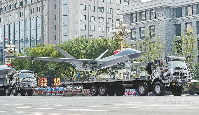在兩輛指揮引導(dǎo)車帶領(lǐng)下,由攻擊-2無人機(jī)、攻擊-11無人機(jī)和反輻射無人機(jī)組成的無人作戰(zhàn)第2方隊通過天安門,向世界展示了中國無人作戰(zhàn)平臺的又一嶄新成就。