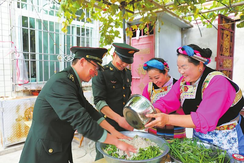 在中國文化中,吃面自古以來就有福壽延綿的美好寓意。圖為10月2日,駐甘孜巴塘官兵與夏邛鎮(zhèn)群眾同吃巴塘冒面,為祖國慶生,祝愿祖國繁榮昌盛、國泰民安。 華西都市報-封面新聞記者 田雪皎 攝