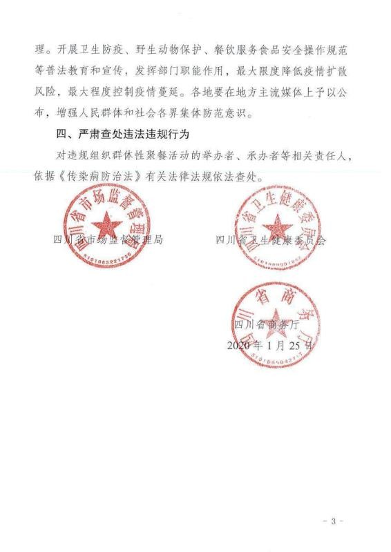 四川新聞網(wǎng)成都1月25日訊(記者 李丹)1月25日,四川省市場監(jiān)督管理局、四川省衛(wèi)生健康委員會(huì)、四川省商務(wù)廳3部門聯(lián)合發(fā)布緊急通知,近期新型冠狀病毒感染的肺炎疫情防控形勢嚴(yán)峻,為認(rèn)真貫徹落實(shí)省委省政府關(guān)于啟動(dòng)重大突發(fā)公共衛(wèi)生事件一級(jí)響應(yīng)措施暨應(yīng)對(duì)新型冠狀病毒感染的肺炎疫情決策部署,有效保證廣大群眾生命安全,根據(jù)《傳染病防治法》等有關(guān)法律法規(guī),禁止任何餐飲單位和個(gè)人舉辦任何形式的群體性聚餐活動(dòng),已經(jīng)訂餐的應(yīng)盡快取消或延期舉辦。
