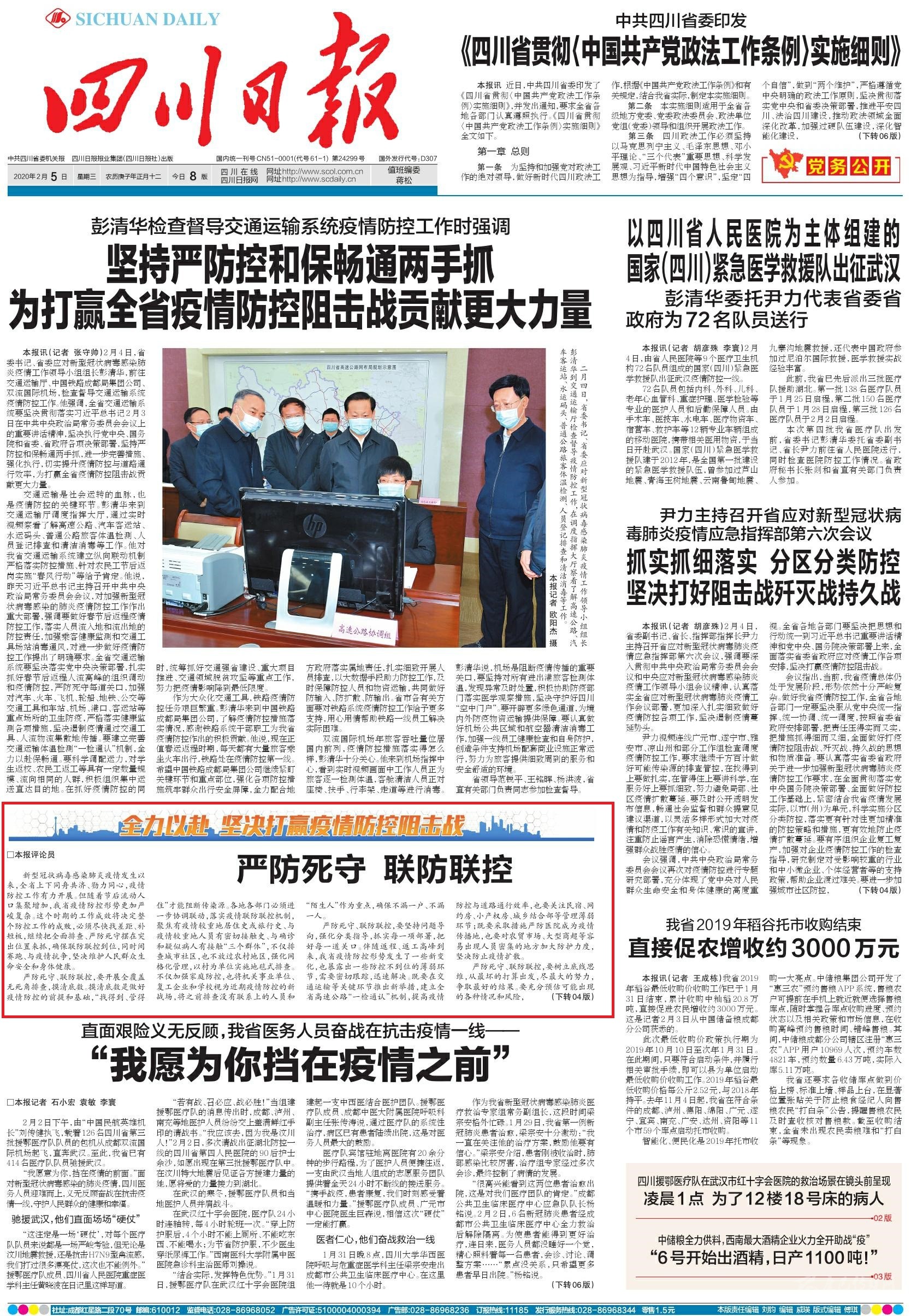 2月4日,省委書記、省委應(yīng)對新型冠狀病毒感染肺炎疫情工作領(lǐng)導(dǎo)小組組長彭清華,前往交通運輸廳、中國鐵路成都局集團公司、雙流國際機場,檢查督導(dǎo)交通運輸系統(tǒng)疫情防控工作。 他強調(diào),全省交通運輸系統(tǒng)要堅決貫徹落實習(xí)近平總書記2月3日在中共中央政治局常務(wù)委員會會議上的重要講話精神,堅決執(zhí)行黨中央、國務(wù)院和省委、省政府各項決策部署,堅持嚴防控和保暢通兩手抓,進一步完善措施、強化執(zhí)行,切實提升疫情防控與道路通行效率,為打贏全省疫情防控阻擊戰(zhàn)貢獻更大力量。 點位:交通運輸廳調(diào)度指揮大廳 交通運輸是社會運轉(zhuǎn)的血脈,也是疫情防控的關(guān)鍵環(huán)節(jié)。彭清華來到交通運輸廳調(diào)度指揮大廳,通過實時視頻察看了解高速公路、汽車客運站、水運碼頭、普通公路旅客體溫檢測、人員登記排查和清潔消毒等工作。 他對我省交通運輸系統(tǒng)建立縱向聯(lián)動機制嚴格落實防控措施、針對農(nóng)民工節(jié)后返崗實施“春風(fēng)行動”等給予肯定。 他說,昨天習(xí)近平總書記主持召開中共中央政治局常務(wù)委員會會議,對加強新型冠狀病毒感染的肺炎疫情防控工作作出重大部署,強調(diào)要做好春節(jié)后返程疫情防控工作,落實人員流入地和流出地的防控責(zé)任,加強乘客健康監(jiān)測和交通工具場站消毒通風(fēng),對進一步做好疫情防控工作提出了明確要求。 全省交通運輸系統(tǒng)—— 要堅決落實黨中央決策部署,扎實抓好春節(jié)后返程人流高峰的組織調(diào)動和疫情防控,嚴防死守每道關(guān)口,加強對汽車、火車、飛機、輪船、地鐵、公交等交通工具和車站、機場、港口、客運站等重點場所的衛(wèi)生防疫,嚴格落實健康監(jiān)測各項措施,堅決遏制疫情通過交通工具、人流物流集散地傳播。 要建立完善交通運輸體溫檢測“一檢通認”機制,全力以赴保暢通。 要科學(xué)調(diào)配運力,對學(xué)生返校、農(nóng)民工返工等具有一定數(shù)量規(guī)模、流向相同的人群,積極組織集中運送直達目的地。在抓好疫情防控的同時,統(tǒng)籌抓好交通強省建設(shè)、重大項目推進、交通領(lǐng)域脫貧攻堅等重點工作,努力把疫情影響降到最低限度。 點位:中國鐵路成都局集團公司 作為大眾化交通工具,鐵路疫情防控任務(wù)艱巨繁重。彭清華來到中國鐵路成都局集團公司,了解疫情防控措施落實情況,感謝鐵路系統(tǒng)干部職工為我省疫情防控作出的積極貢獻。 他說,現(xiàn)在正值春運返程時期,每天都有大量旅客乘坐火車出行,鐵路處在疫情防控第一線。希望中國鐵路成都局集團公司繼續(xù)緊盯關(guān)鍵環(huán)節(jié)和重點部位,強化各項防控措施筑牢群眾出行安全屏障,全力配合地方政府落實屬地責(zé)任,扎實細致開展人員排查,以大數(shù)據(jù)手段助力防控工作,及時保障防控人員和物資運輸,共同做好防輸入、防擴散、防輸出。 省市各有關(guān)方面要對鐵路系統(tǒng)疫情防控工作給予更多支持,用心用情幫助鐵路一線員工解決實際困難。 點位:雙流國際機場指揮中心 雙流國際機場年旅客吞吐量位居國內(nèi)前列,疫情防控措施落實得怎么樣,彭清華十分關(guān)心。 他來到機場指揮中心,看到實時視頻畫面中工作人員正為旅客逐一檢測體溫,客艙清潔人員正對座椅、扶手、行李架、走道等進行消毒。 彭清華說,機場是阻斷疫情傳播的重要關(guān)口—— 要堅持對所有進出港旅客檢測體溫,發(fā)現(xiàn)異常及時處置,積極協(xié)助防疫部門落實醫(yī)學(xué)觀察措施,堅決守護好四川“空中門戶”。 要開辟更多綠色通道,為境內(nèi)外防疫物資運輸提供保障。 要認真做好機場公共區(qū)域和航空器清潔消毒工作,加強一線員工健康檢查和自身防護,創(chuàng)造條件支持機場配套商業(yè)設(shè)施正常運行,努力為旅客提供細致周到的服務(wù)和安全舒適的環(huán)境。 省領(lǐng)導(dǎo)范銳平、王銘暉、楊洪波,省直有關(guān)部門負責(zé)同志參加檢查督導(dǎo)。 川報觀察記者 張守帥 攝影 歐陽杰