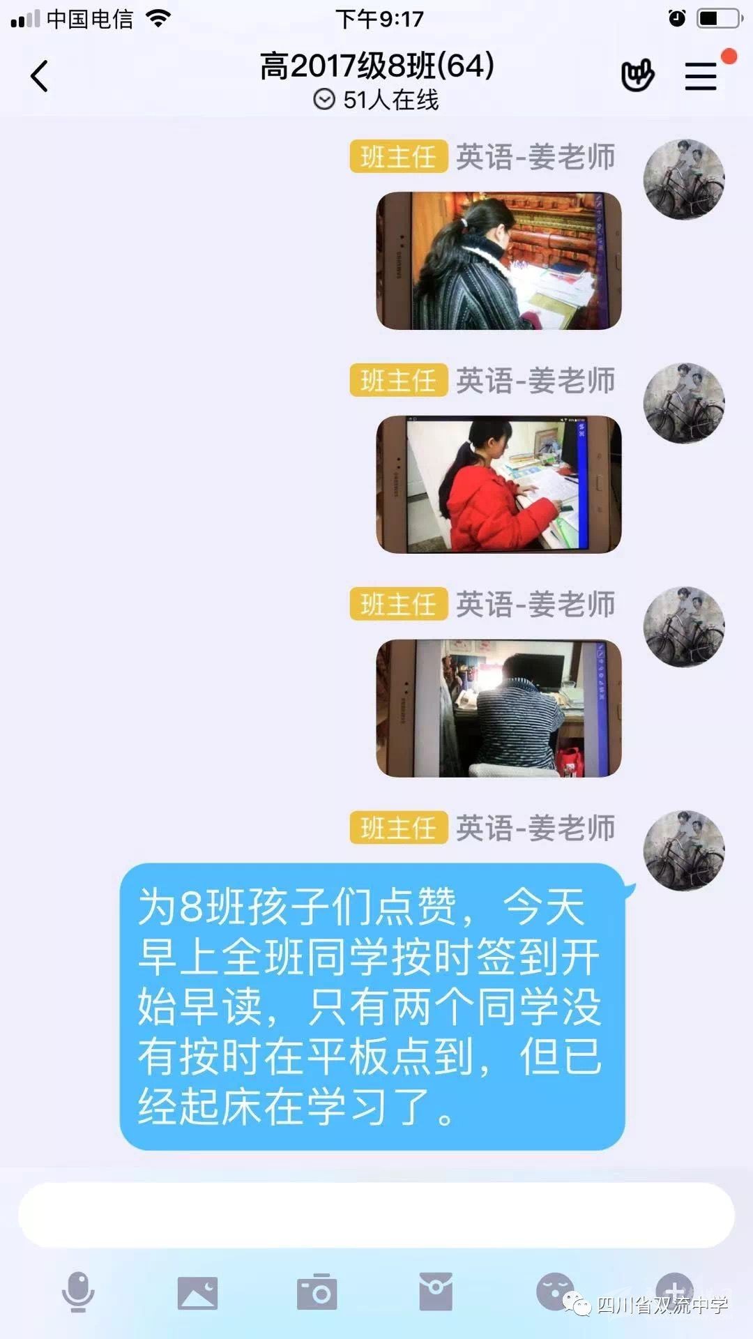 2月6日早上7時(shí),雙流中學(xué)高三年級(jí)學(xué)生自主復(fù)習(xí)線上教學(xué)、管理正在進(jìn)行。班主任們通過家長微信群、學(xué)生平板班級(jí)群開始點(diǎn)到,保障學(xué)習(xí)效果,從恢復(fù)在校作息開始!