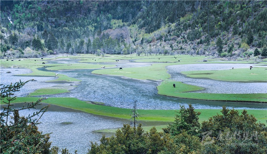 四川甘孜藏族自治州稻城縣濕地公園一景(6月17日攝,無人機(jī)照片)。新華社記者 尹恒 攝