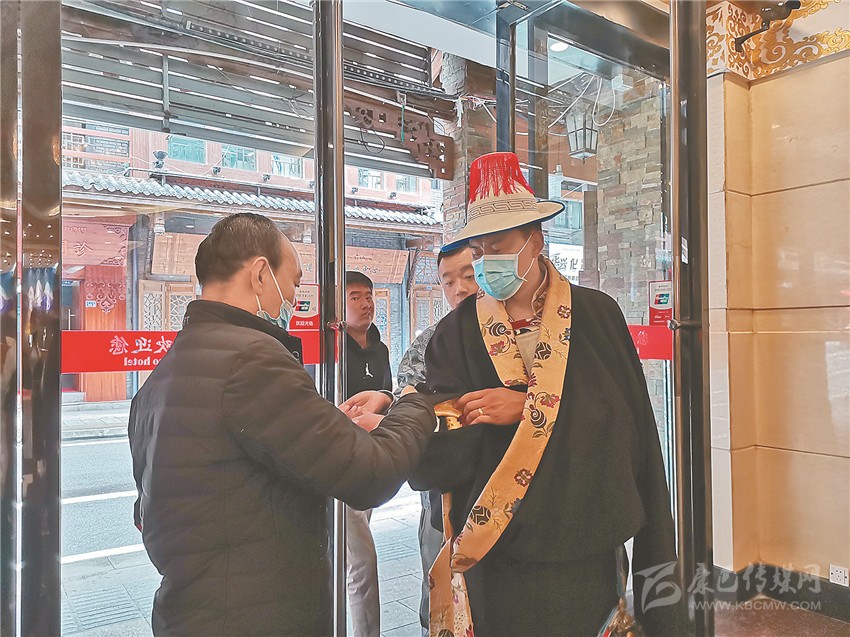 色達(dá)縣演出隊(duì)入住邦金麥朵酒店。每天,酒店安保人員多扎準(zhǔn)時(shí)出現(xiàn)在門口,提醒演職人員測(cè)量體溫、佩戴口罩。“我是酒店的第一關(guān)卡,拉姆是第二關(guān),我倆相互配合,表演節(jié)目的客人住得放心,演出的節(jié)目才會(huì)更加精彩。”拿著體溫槍,多扎一臉自豪地說(shuō)。