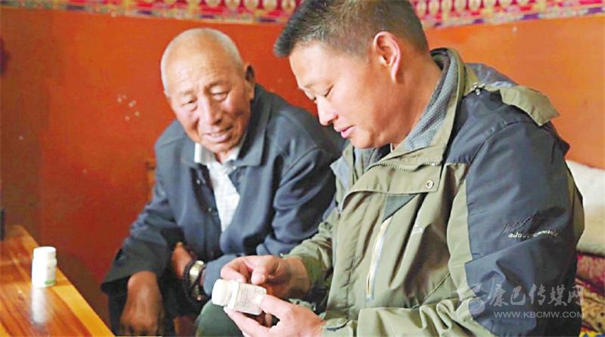 李明康(右)探望因病致貧的石渠老人扎西。鄔華宇攝