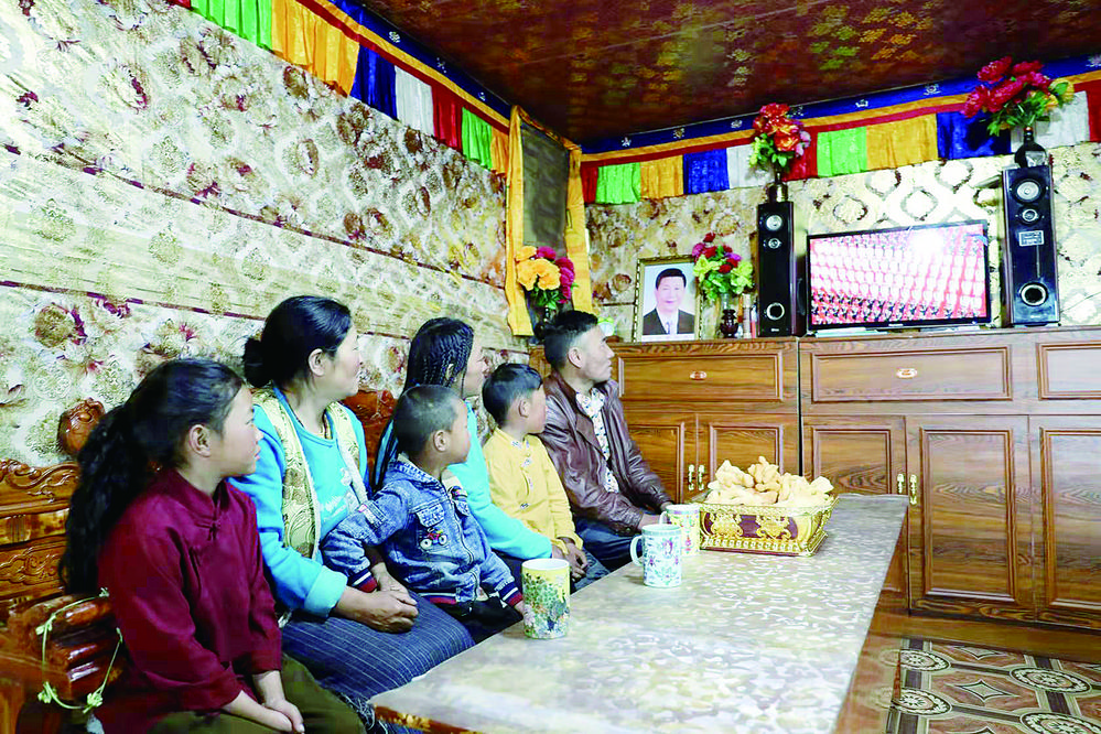 石渠縣蒙宜鎮(zhèn)牧民澤仁巴措一家觀看慶祝大會直播。