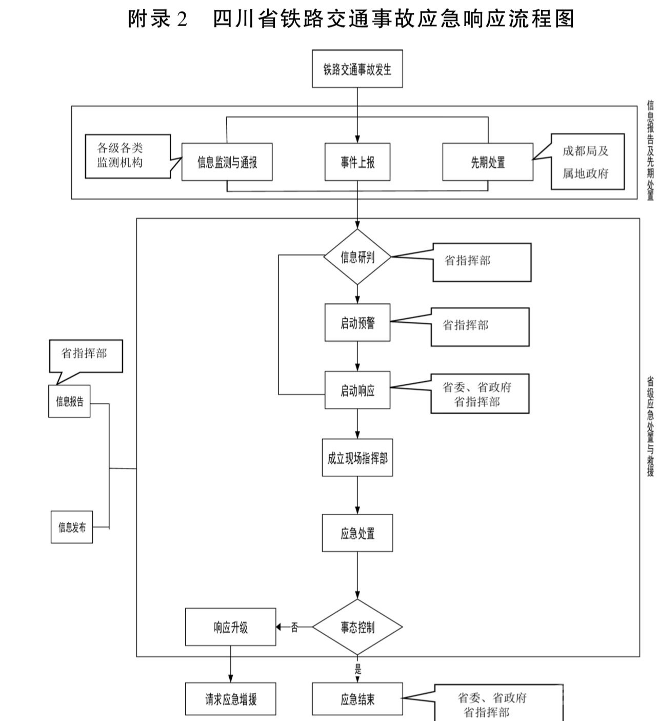 當(dāng)出現(xiàn)重大鐵路交通事故時,實(shí)行分級應(yīng)對。初判發(fā)生特別重大、重大事故,由省級層面負(fù)責(zé)應(yīng)對;初判發(fā)生較大、一般事故,分別由事發(fā)地市(州)和縣(市、區(qū))層面負(fù)責(zé)應(yīng)對,或按照上級組織指揮機(jī)構(gòu)要求具體組織調(diào)度。