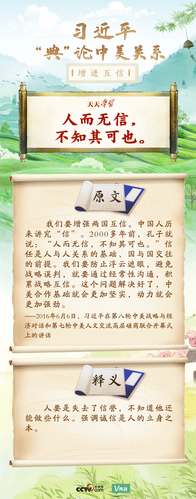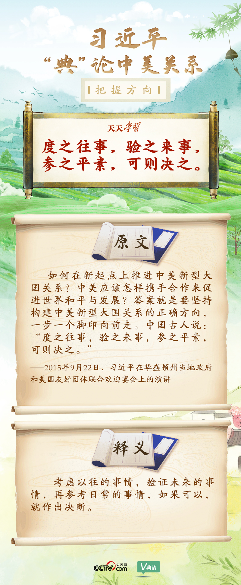 黨的十八大以來,習近平主席就中美關系發(fā)表了一系列重要講話。他站在時代高度分析、研判中美關系現(xiàn)狀及發(fā)展趨勢,并引經(jīng)據(jù)典為發(fā)展中美關系指出正確方向。這些論述蘊含深刻的戰(zhàn)略思維和政治智慧,具有重大現(xiàn)實意義和深遠歷史意義。央視網(wǎng)《天天學習》與您一起深刻領會。