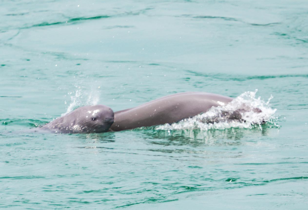 △湖北省宜昌市,江豚在葛洲壩下游水域逐浪嬉戲(2023年5月20日攝)。根據(jù)農(nóng)業(yè)農(nóng)村部2023年2月28日公布的2022年長(zhǎng)江江豚科學(xué)考察結(jié)果,長(zhǎng)江江豚種群數(shù)量為1249頭。與2017年上一次科學(xué)考察相比,江豚數(shù)量出現(xiàn)了止跌回升的歷史性轉(zhuǎn)折。