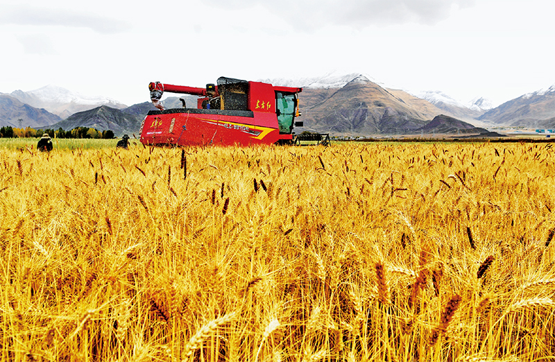 近年來,西藏自治區(qū)積極實施耕地改造,通過開展高標準農(nóng)田建設,全方位提升耕地質量與糧食產(chǎn)量,夯實糧食安全基礎。圖為工作人員駕駛農(nóng)業(yè)機械在拉薩市林周縣曲果強村的高標準農(nóng)田里收獲小麥(2023年10月12日攝)。 新華社記者 張汝鋒/攝