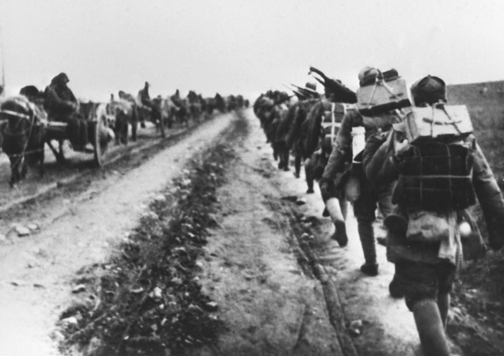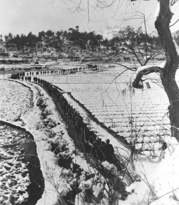 ↑ 抗日戰(zhàn)爭期間,新四軍在蘇北冰天雪地中行進。