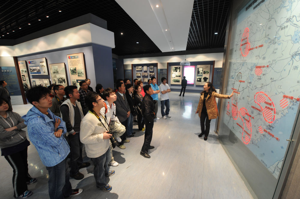 ↑ 在鹽城新四軍紀念館內(nèi),講解員在向觀眾介紹南方紅軍游擊隊整編為新四軍示意圖(2011年5月26日攝)。