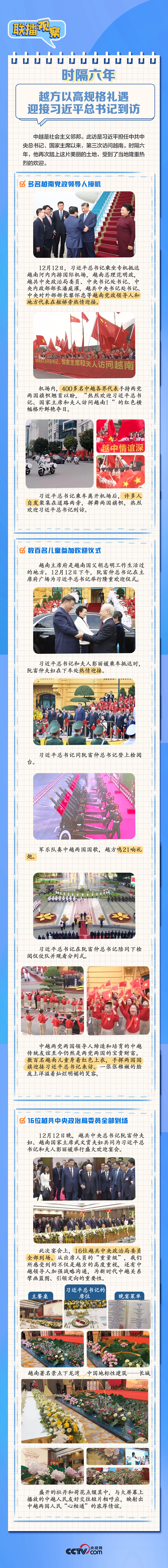 多名越南黨政領(lǐng)導(dǎo)人接機(jī)、中越各界代表手持兩黨兩國(guó)旗幟夾道歡迎、16位越共中央政治局委員全部到場(chǎng)參加歡迎宴會(huì)……訪越期間,習(xí)近平總書(shū)記受到越方高規(guī)格熱情接待,點(diǎn)滴細(xì)節(jié)見(jiàn)證兩國(guó)“同志加兄弟”情誼。