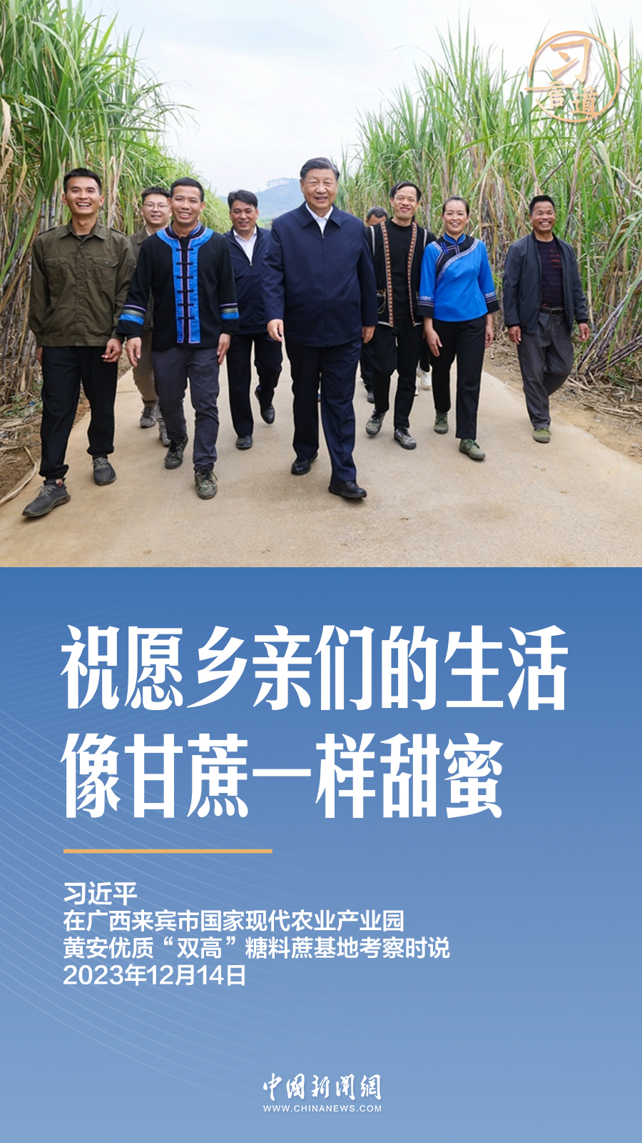 12月14日,在廣西來賓的甘蔗林里,習近平向蔗農(nóng)送上祝福:祝愿鄉(xiāng)親們的生活像甘蔗一樣甜蜜。