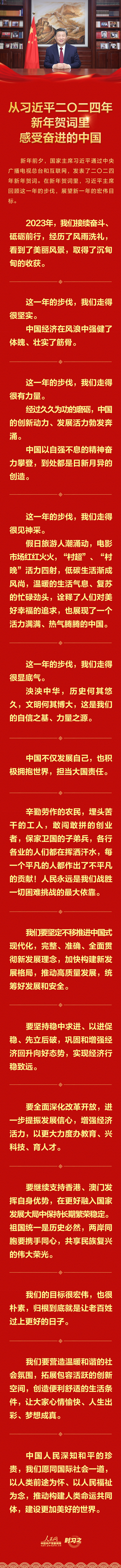 2023年12月31日晚,國家主席習近平在北京發(fā)表二〇二四年新年賀詞。賀詞飽含對廣大人民群眾的深情,彰顯對中國發(fā)展的堅定信心?;厥走^往,展望未來;砥礪前行,征程再起。讓我們一起在習近平主席的新年賀詞中感受直抵心靈的溫暖、催人奮進的力量!