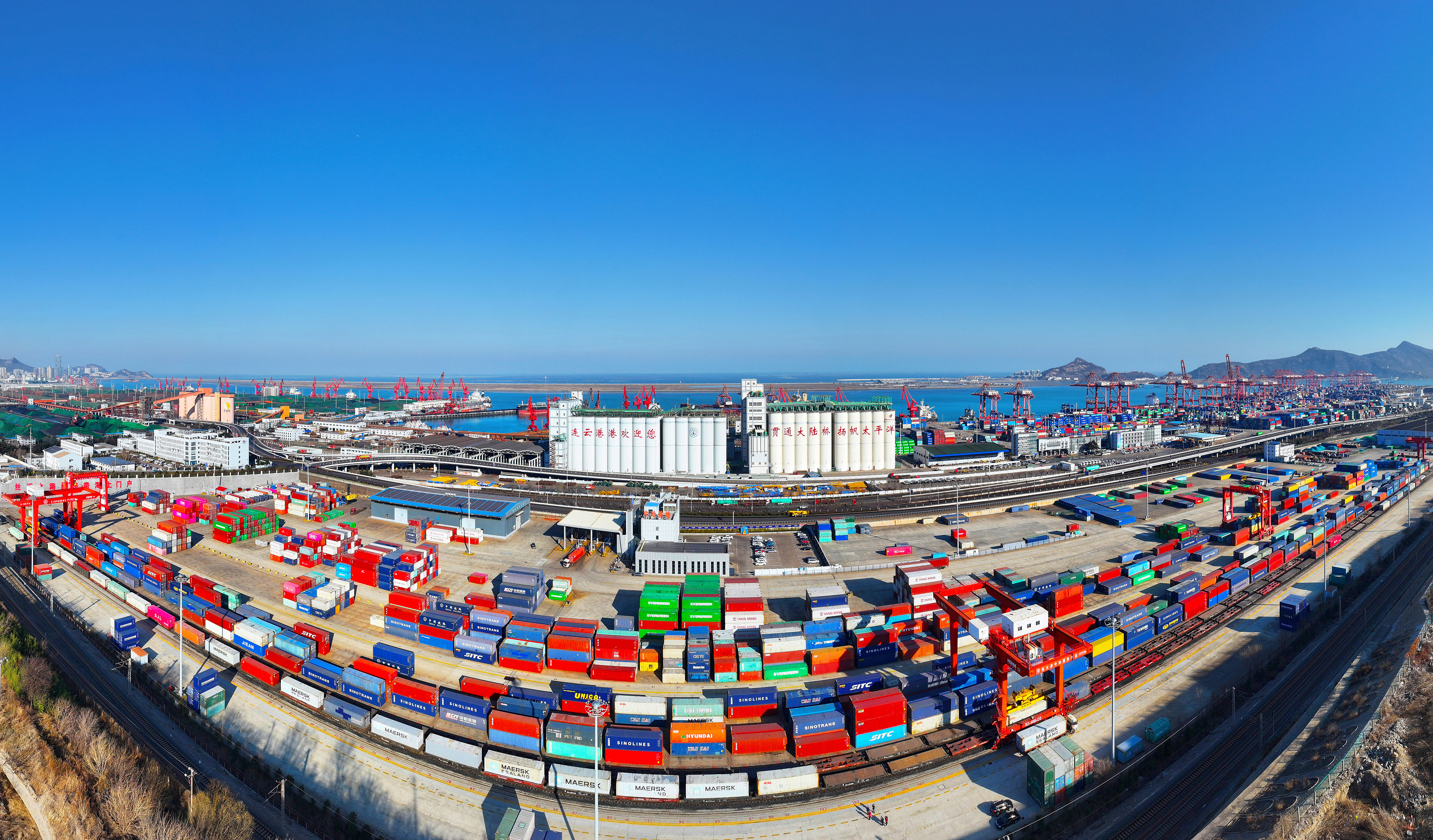 2024年1月10日,江蘇省連云港市,大型機械正在裝運集裝箱貨柜。