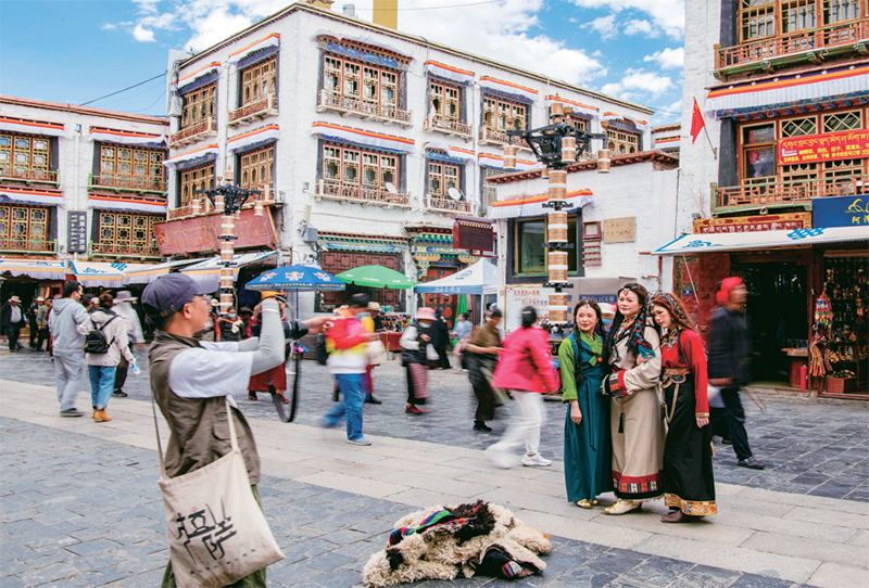 千年八廓街,見證民族團結(jié)。2021年7月,習(xí)近平總書記來到位于西藏拉薩老城區(qū)的八廓街,感慨地說:“千年八廓街,是我們各民族建起來的八廓街。各民族文化在這里交流交往交融,我們中華民族的大家庭在這里其樂融融。”圖為2023年6月13日,游客身著藏裝在八廓街拍照留念。 新華社記者 姜帆/攝
