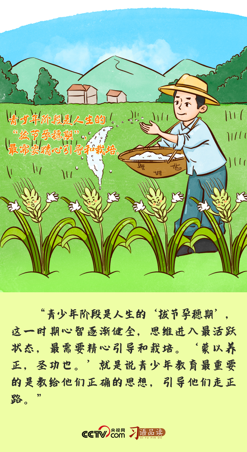 “拔節(jié)孕穗期”是禾谷類作物汲取養(yǎng)分、生長發(fā)育最快的階段,也是決定這一年收成多少的重要時期,需要農(nóng)人精心照料。處在人生“拔節(jié)孕穗期”的青少年階段,也是一個人一生中世界觀、人生觀、價值觀打底塑形的關(guān)鍵時期,正確的引導(dǎo)和悉心栽培至關(guān)重要。