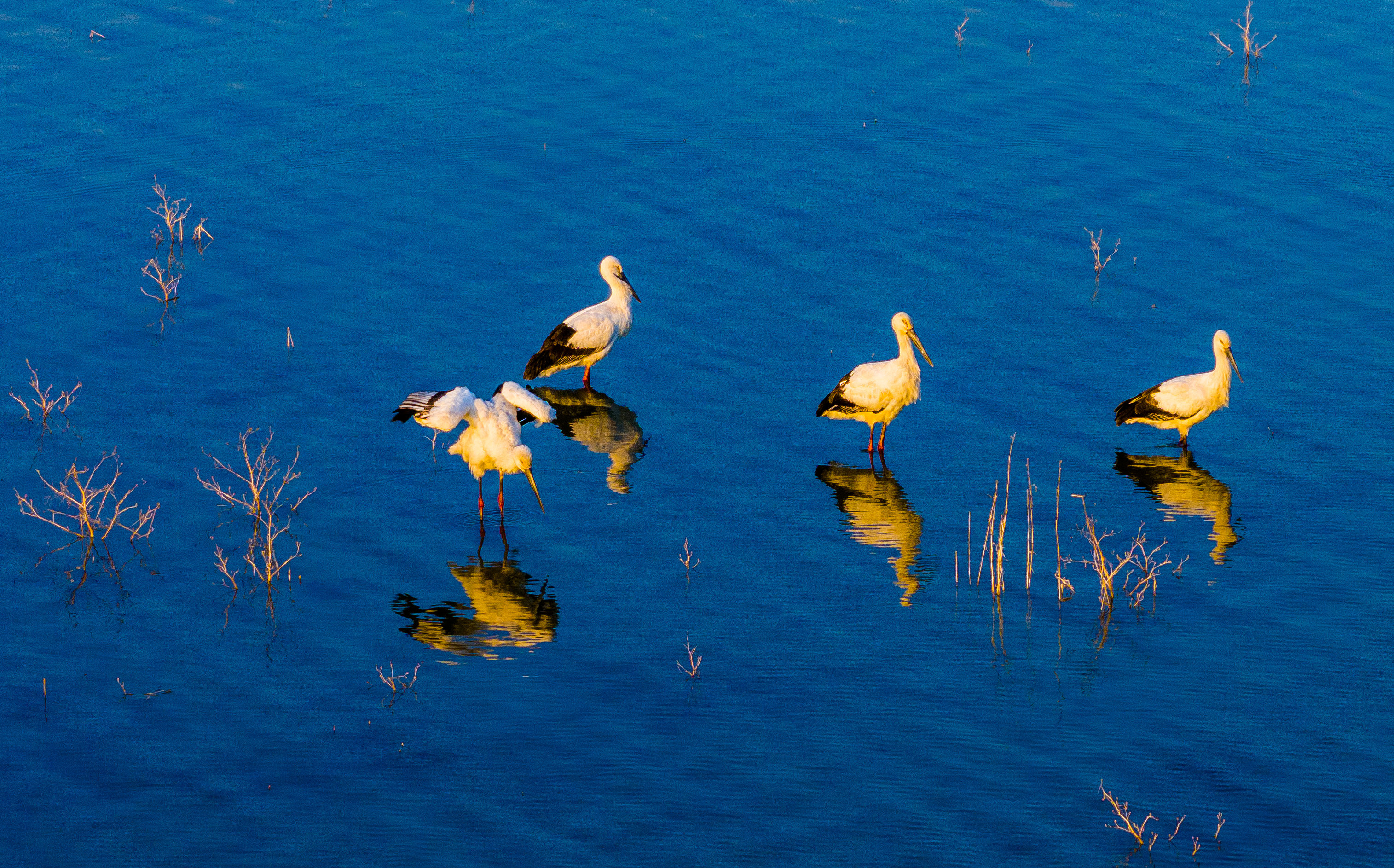 △ 2023年12月1日,安徽淮北,烈山區(qū)化家湖,4只遷徙的國寶級(jí)野生動(dòng)物東方白鸛在休憩、覓食。