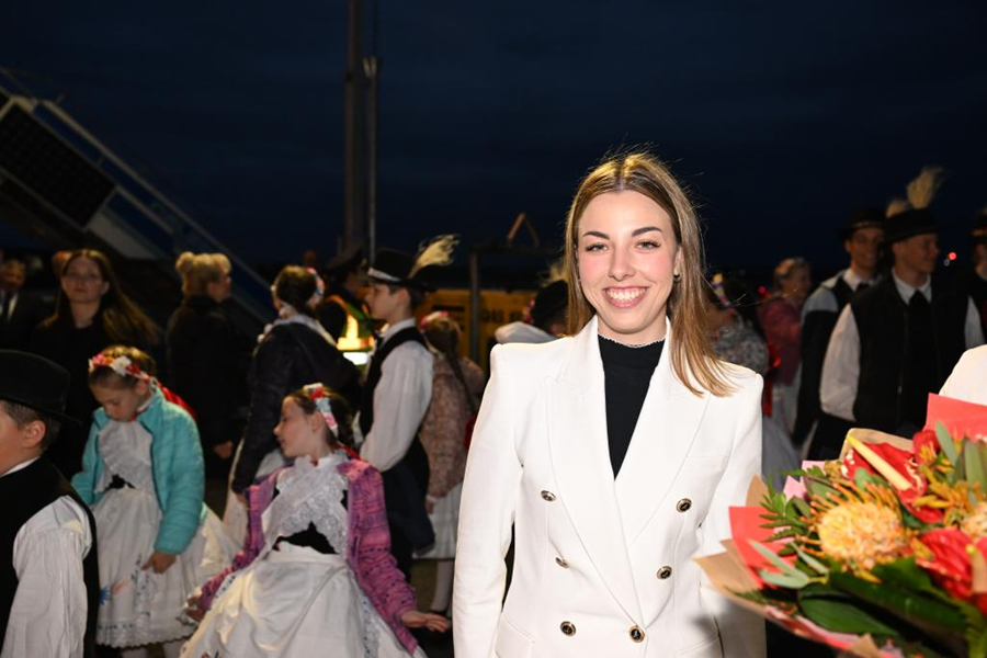 ??當?shù)貢r間5月8日晚,在匈牙利布達佩斯國際機場歡迎隊伍中的匈牙利姑娘歐拉·塔瑪拉。新華社記者 謝環(huán)馳 攝