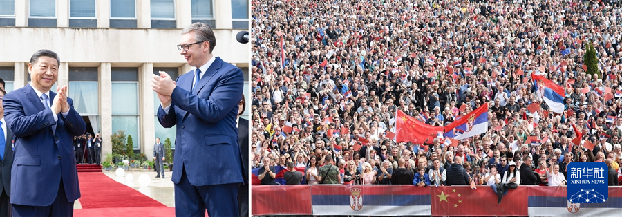 ??當?shù)貢r間5月8日上午,國家主席習近平在貝爾格萊德塞爾維亞大廈同塞爾維亞總統(tǒng)武契奇舉行會談。會談前,武契奇陪同習近平來到政府大廈平臺(左圖)。大廈廣場上,一萬五千名塞爾維亞民眾揮舞中塞兩國國旗,對習近平表示最熱烈的歡迎(右圖)。(拼版照片) 新華社記者 黃敬文 丁海濤 攝