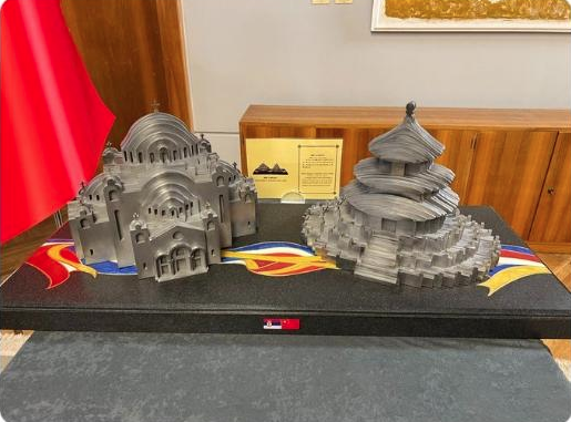 ??習近平主席送給武契奇兩件工藝品,分別是鋼材質的天壇和圣薩瓦教堂造型。
