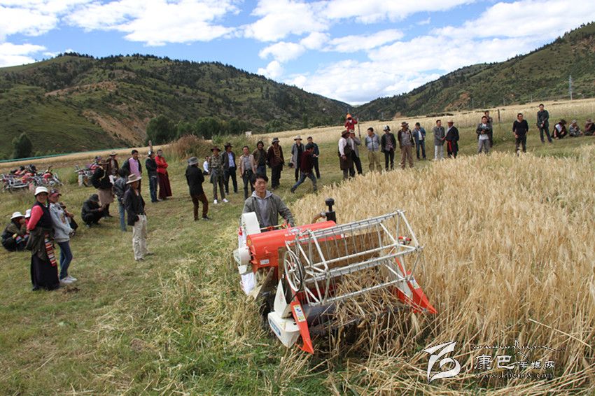 9月14日,在海拔3600多米的理塘縣甲洼鄉(xiāng)下依村成熟青稞地里,縣農(nóng)牧和科技局的農(nóng)機(jī)手正用小型聯(lián)合收割機(jī)示范收割青稞。7個(gè)行政村的村支書(shū)、村主任在現(xiàn)場(chǎng)觀摩學(xué)習(xí)。俄曲村支書(shū)洛真說(shuō):“這個(gè)小型聯(lián)合收割機(jī)很適合我們高原,這將大大減輕我們的勞動(dòng)強(qiáng)度,不用再擔(dān)心下雨影響搶收。” (葉強(qiáng)平 攝影報(bào)道)