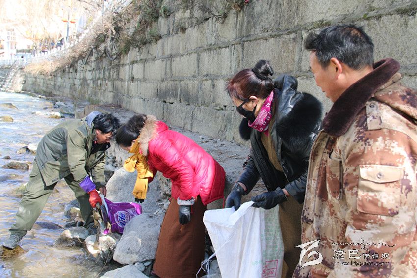 冬季的折多河水流量少,河水較淺,河道邊有許多地方都裸露出來。記者看見,有兩男兩女腳穿水靴踩在河邊正在撿拾樹枝、菜葉、白色塑料袋等雜物,其中一個男子雙手都攥滿了爛菜葉,其余三個人手里也都拎著一個滿滿的編織袋。記者上前和那名手攥爛菜葉的男子進行交談,得知他們并不是拾荒者,而是康定市市政管理局專門負責(zé)清理河道衛(wèi)生的清潔工。