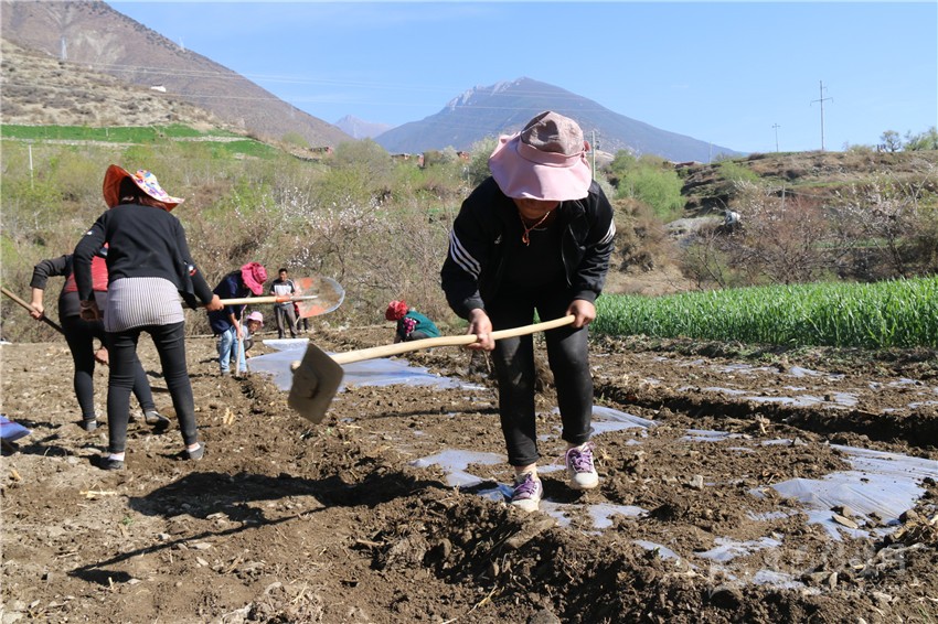 4月15日,記者從巴塘縣城出發(fā),沿國道318線走訪了該縣的5個(gè)村莊,沿途看到絕大多數(shù)耕地都鋪上了地膜,記者在該縣黨巴鄉(xiāng)玉卡通村看到正在忙碌播種玉米的村民。而這支春耕隊(duì)伍的“帶頭人”正是該村村民大尼瑪,在場(chǎng)的人都是其家人或鄰居。