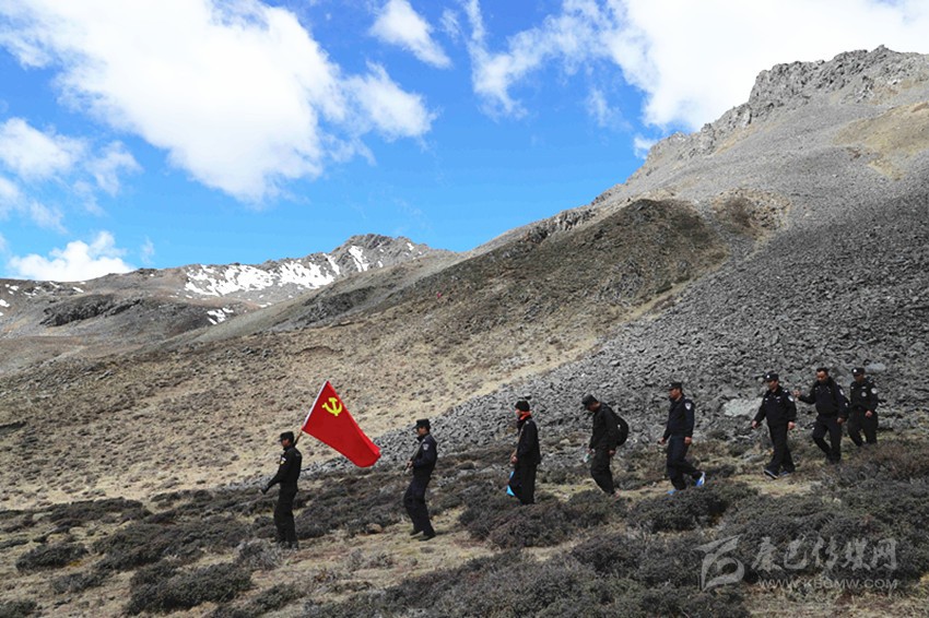 為確保蟲草采挖期間的社會治安穩(wěn)定,縣公安局抽調(diào)精干力量,前往哈幾山、莫庫溝等多個蟲草采挖點開展巡山維穩(wěn)。這次和我們一起開展常規(guī)巡邏的共有8名公安干警。降初是本地人,1.78米的個子,一路上,他高舉黨旗、步履矯健、勇往直前,成為我們大家的“領(lǐng)路人”,大家經(jīng)常和他開玩笑說:“跟著黨(旗)走永遠(yuǎn)不迷路”。