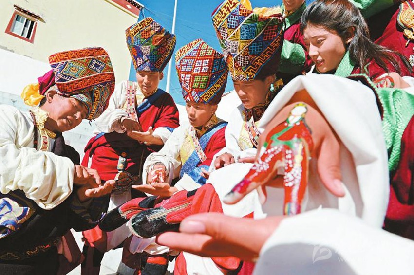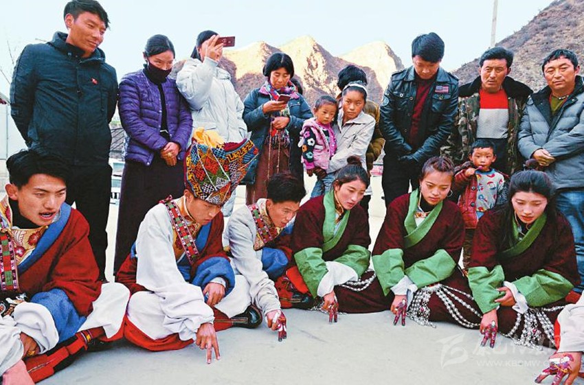2017年12月22日,白玉縣城陽(yáng)光普照,縣藝術(shù)團(tuán)一群“90后”藏族演員用顏料相互在食指和中指上熟練地繪制著具有當(dāng)?shù)孛袼滋厣娜宋飯D案。音樂(lè)響起,演員們的手指隨著節(jié)拍翩翩起舞,左挪右轉(zhuǎn)。隨著唱詞和曲調(diào)的變化,手指的動(dòng)作幅度和節(jié)奏也隨之變化。藝人的情感起伏、喜怒哀樂(lè)被“小人”般的手指表現(xiàn)得淋漓盡致。