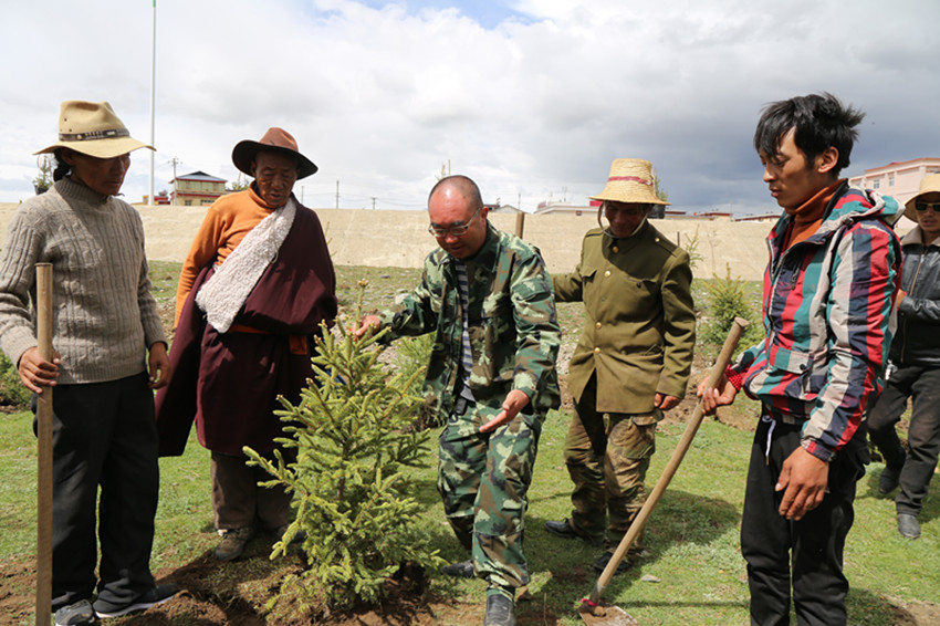 林業(yè)人員正在指導(dǎo)牧民植樹(shù)。
