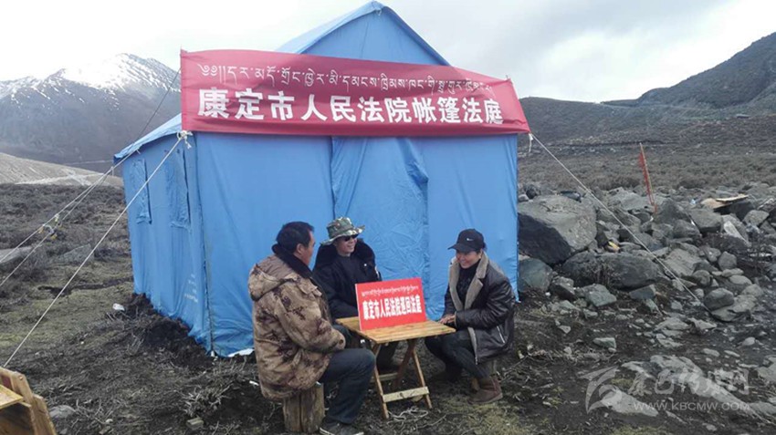 康定市人民法院把巡回法庭搬上山, 在一個簡陋的帳篷外,法律服務站(點)設在值勤點,一手抓穩(wěn)定、一手抓審判?!皫づ穹ㄍァ钡姆ü僭诖迕窦议T口審案子,把嚴肅的法理融入知心話告訴當事人,拉近與當事人間的距離,更易于化解矛盾。農牧民群眾在春播秋收季節(jié)、蟲草采挖季節(jié)和冬季牧場搬遷時往往忙于勞作,很難抽出時間到法院參加訴訟,因此影響了他們通過司法途徑維護自己的合法權益。采用“帳篷法庭”、巡回審理的方式就地辦案,及時調處矛盾糾紛,為群眾提供了便捷的司法服務。