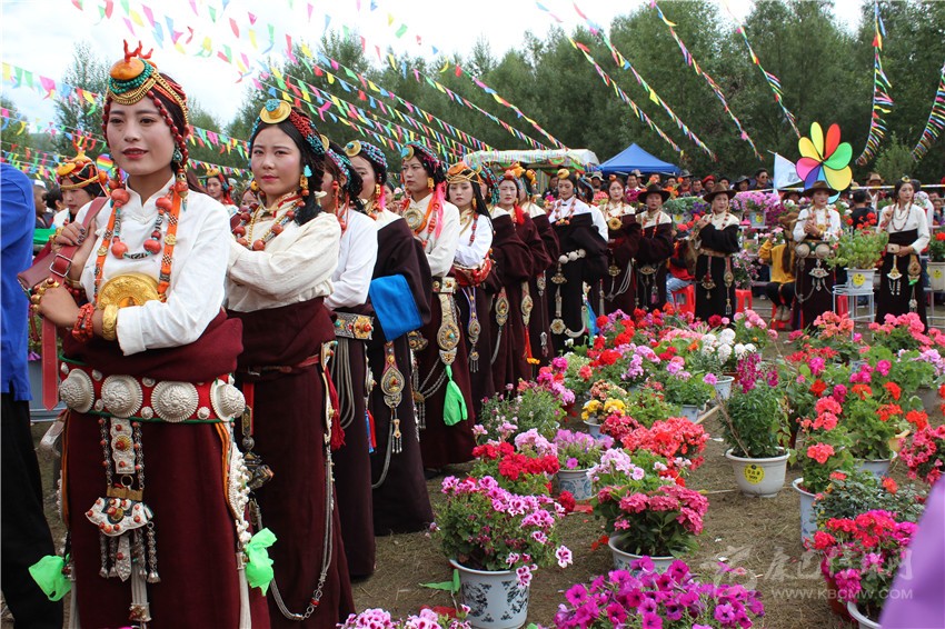 當(dāng)天,身著色彩艷麗藏族服飾的表演者徜徉在花海中,與群眾游客聚集在一起,賞美景、品華服,傳承藏族禮儀文化、傳播藏民族服飾文化,沉浸在喜慶氛圍中。